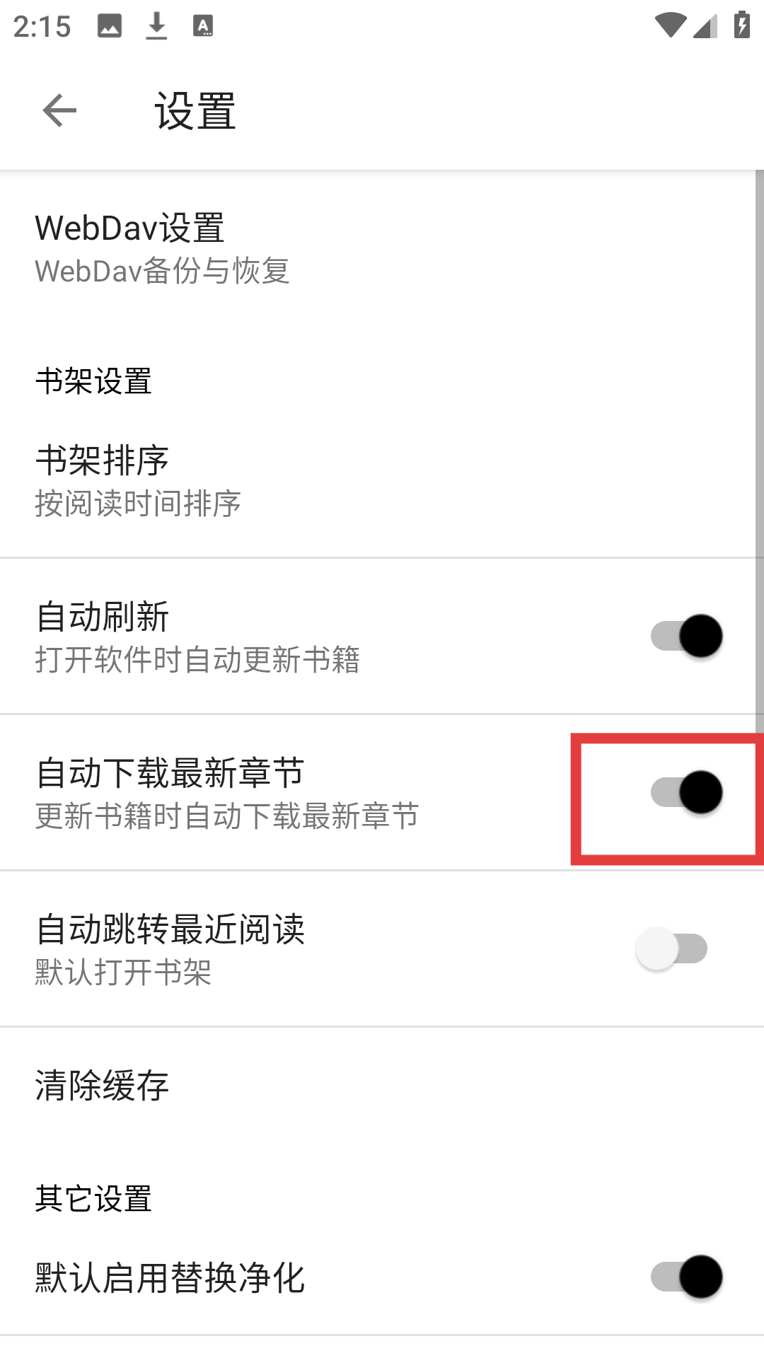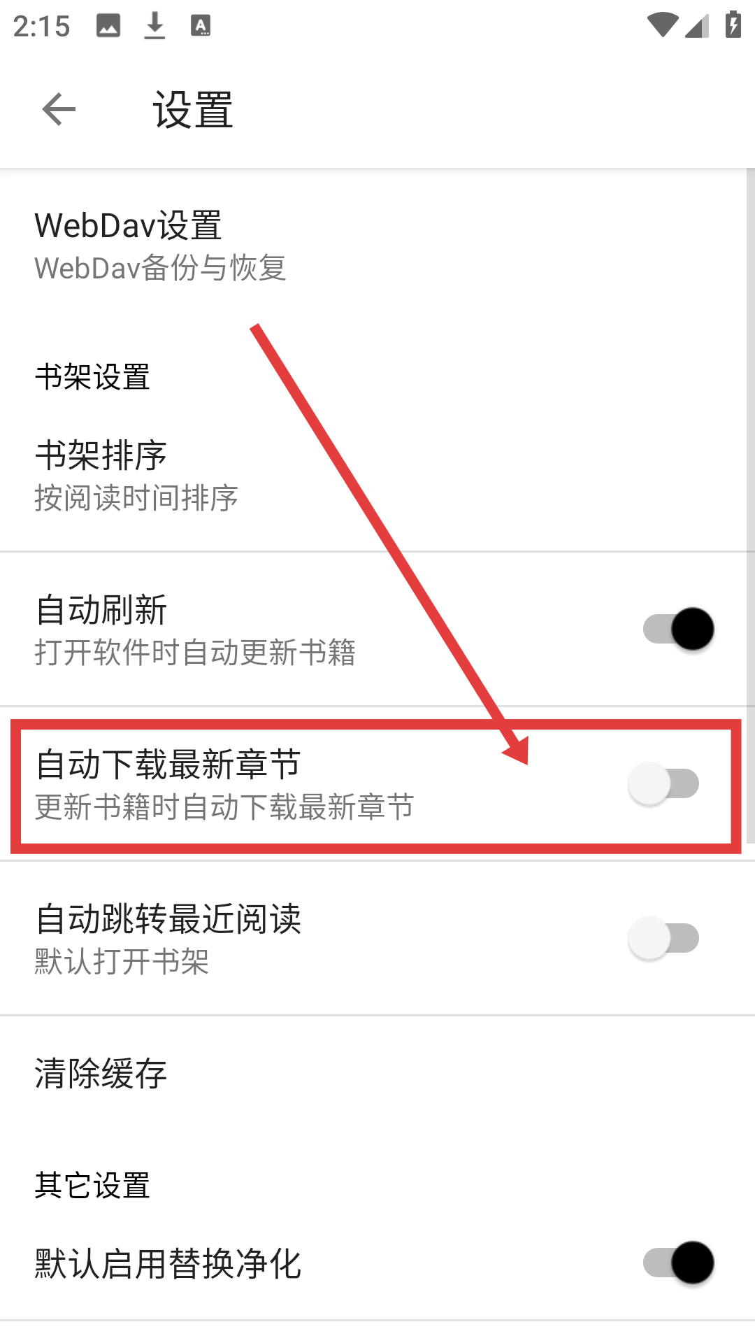 3、在设置页面,找到【自动下载最新章节】选项,可看到其开关状态,准备开启该功能啦。