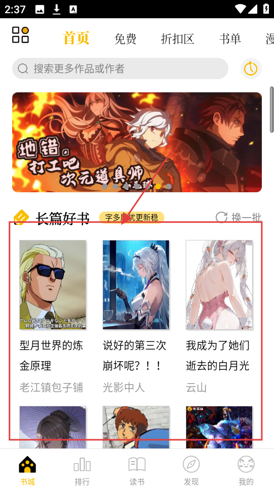 1、在书城首页的长篇好书板块,点击【型月世界的炼金原理】书籍封面,可进入书籍详情页,了解书籍信息啦。