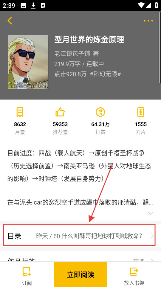 2、进入书籍详情页后,点击【目录】,可进入章节列表页面,查看书籍的章节内容哦。