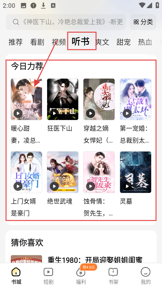 1、打开APP,在书城切换到【听书】板块,挑选今日力荐的小说,比如【暖心甜妻,凌总晚安】啦。