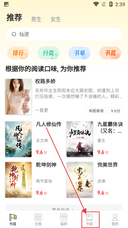 1、打开饭团追书APP,点击底部【书架】,进入书架页面,可查看已添加的小说啦。