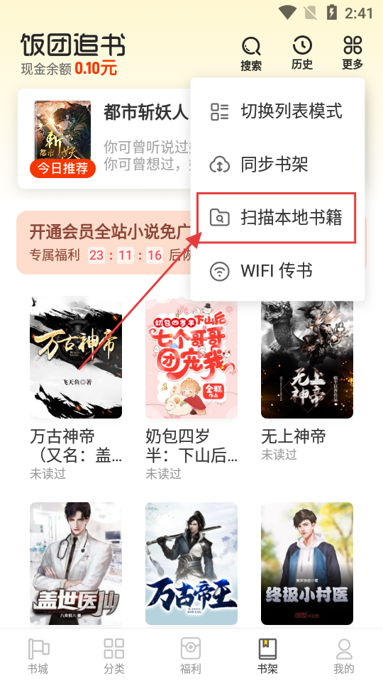 2、在书架页面,点击右上角【更多】,弹出功能菜单,能看到扫描本地书籍等选项哦。
