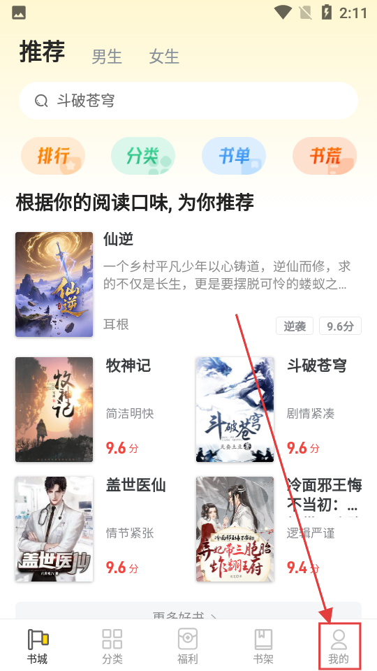 1、进入软件,能看到推荐的小说,若想管理个人相关内容,就点击右下角【我的】按钮吧。