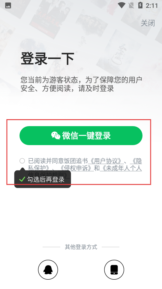 4、创建书单时,若需要登录,就勾选协议,再点击【微信一键登录】,完成登录操作。