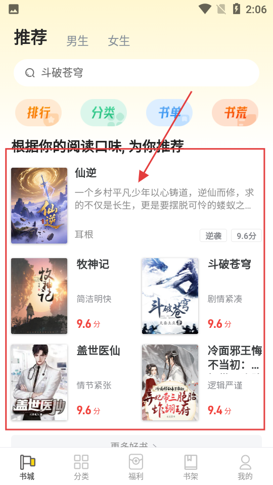 1、我们进入软件,能看到推荐的小说列表,若对某本小说感兴趣,点击小说封面或标题吧。