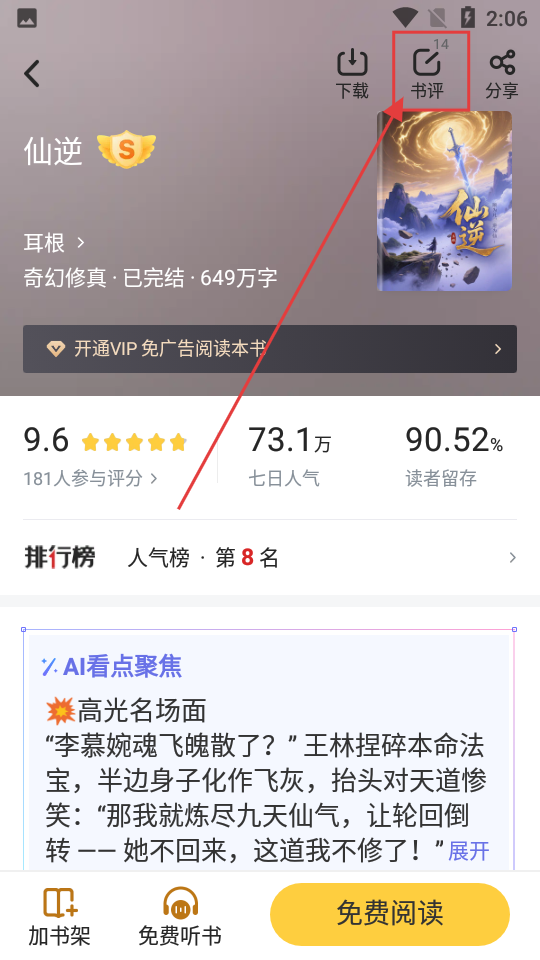 2、进入小说详情页,能看到评分、人气等信息,若要看其他读者的评论,点击【书评】哦。