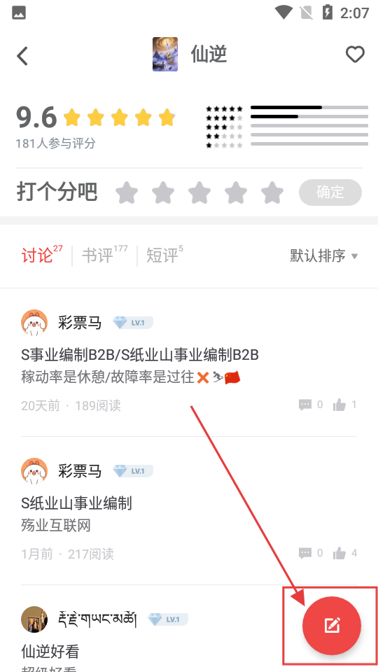 3、进入书评页面,能看到读者的讨论内容,若要发表自己的看法,点击右下角编辑按钮呀。