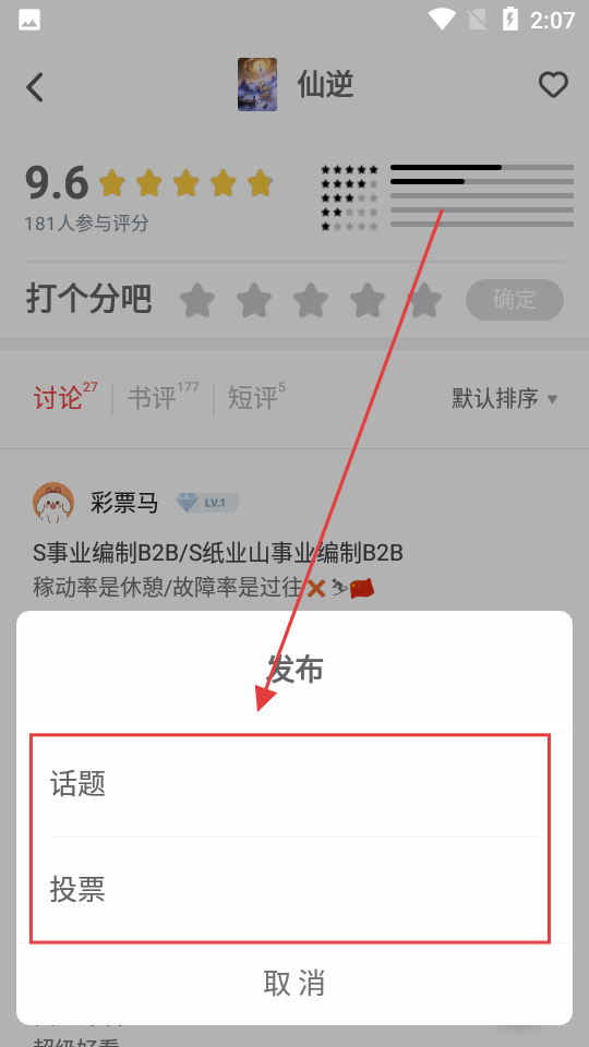 4、点击后会弹出发布选项,可选择发话题或投票,选好后就能发布自己的内容啦。