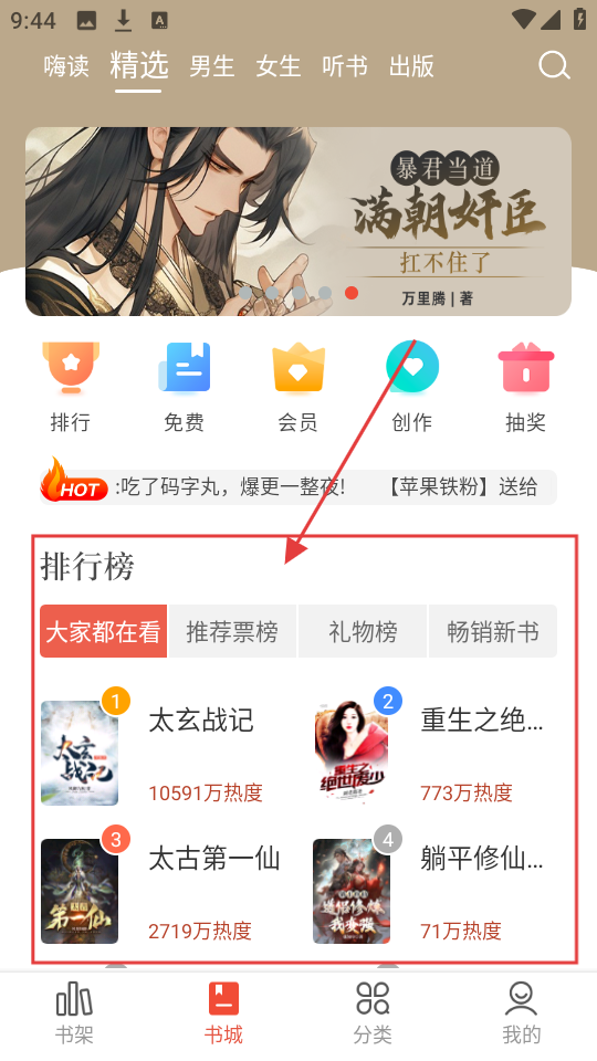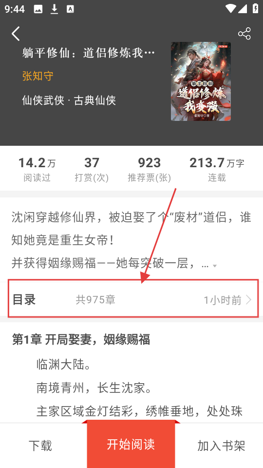 1、在书城排行榜找到《躺平修仙:道侣修炼我…》,点击进入,就能看到小说详情啦。
