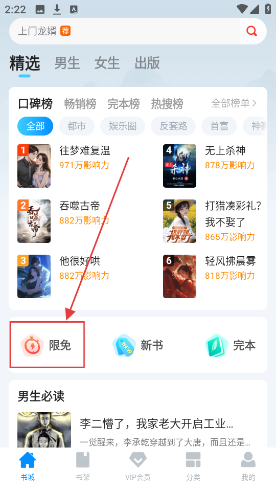 1、在书城页面,点击【限免】,可进入限时免费页面,查看限免书籍啦。