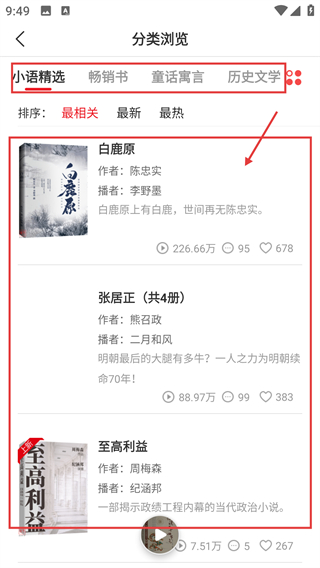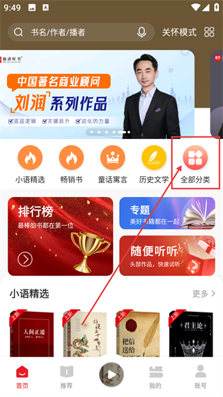1、进入听书应用主界面后,点击【全部分类】选项,就能展开书籍分类列表挑选想听的内容啦。