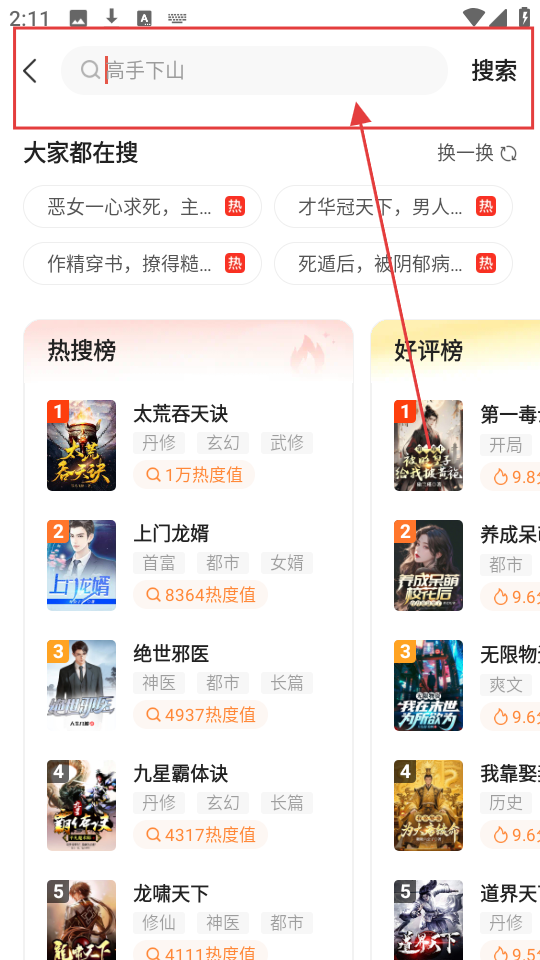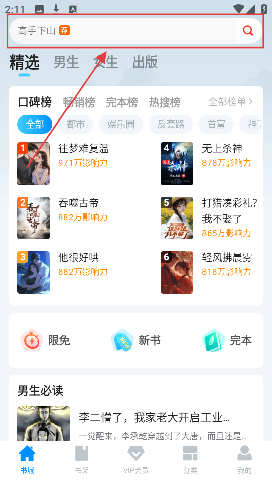 1、在书城页面,点击顶部搜索框,可输入关键词,搜索感兴趣的书籍啦。