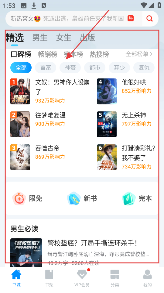 1、在书城页面,可浏览口碑榜、畅销榜等榜单,找到感兴趣的书籍啦。