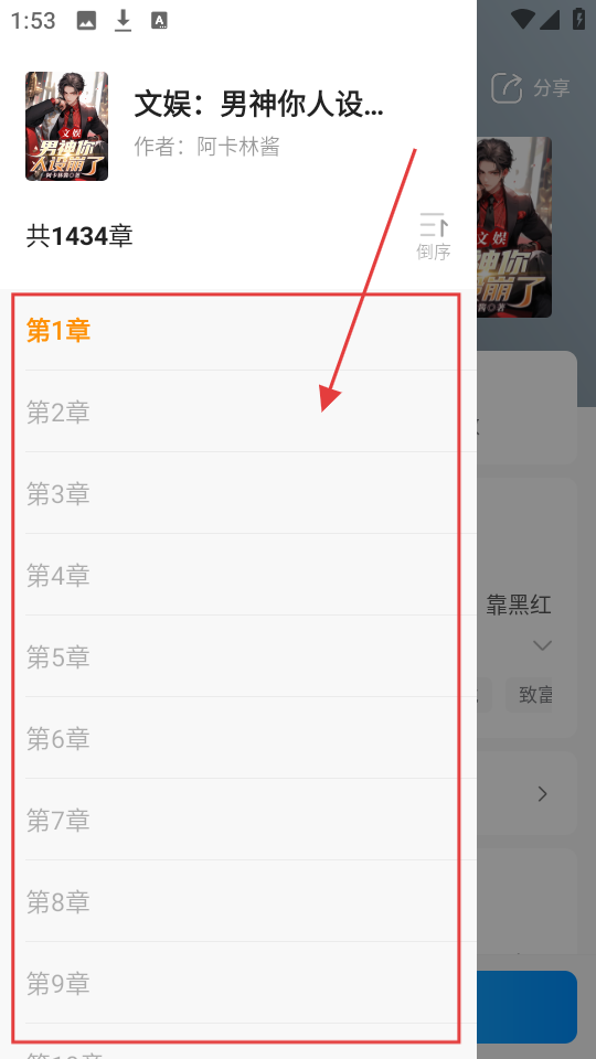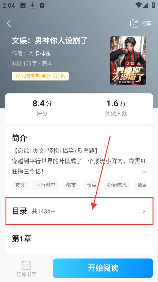 2、进入书籍详情页后,点击【目录】,可进入章节选择页面,选择想读的章节哦。