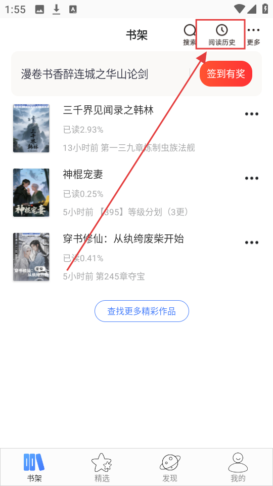 2、在书架页面点击【阅读历史】,就能看到之前阅读过的小说记录啦。