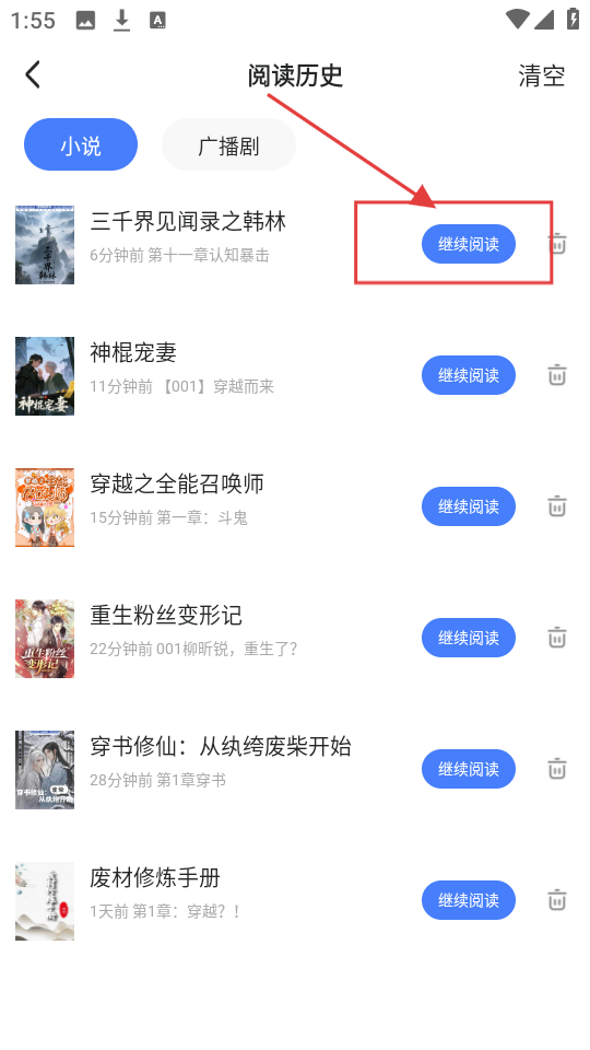 3、在阅读历史页面点击【继续阅读】,就能接着之前的进度阅读小说,超方便哦。