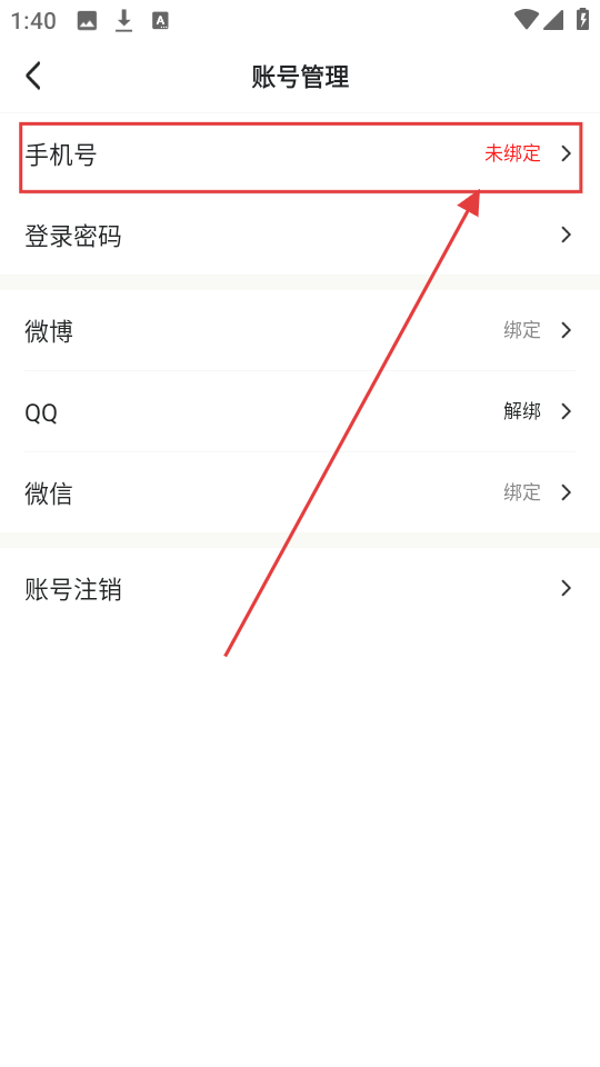3、在账号管理页面,点击【手机号-未绑定】,可进入绑定手机号页面,准备绑定手机号啦。