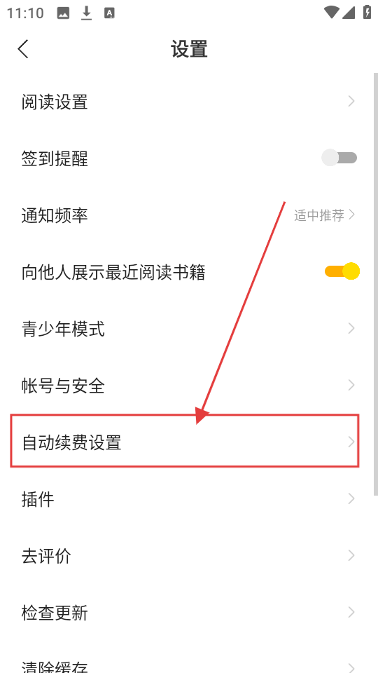 3、在设置页面,找到【自动续费设置】选项并点击,进入自动续费设置页面呢。