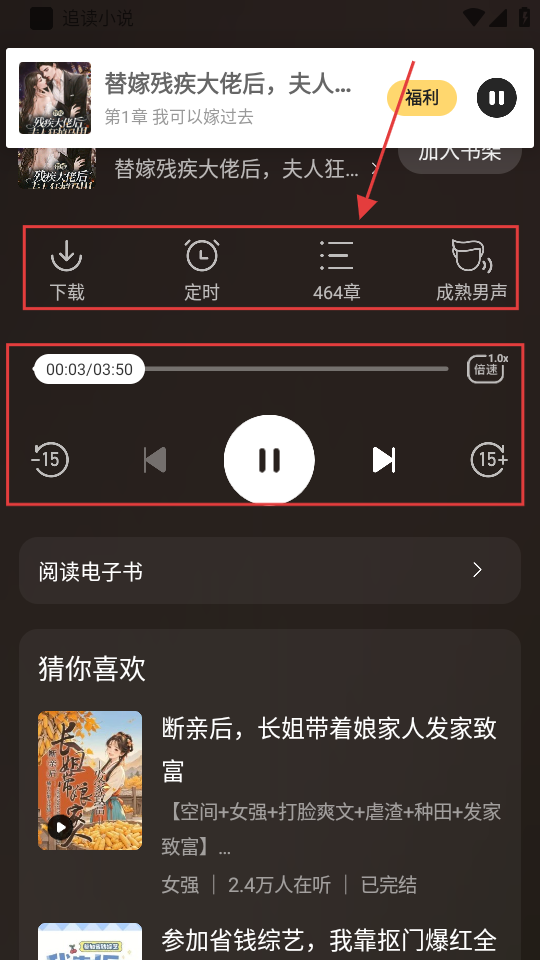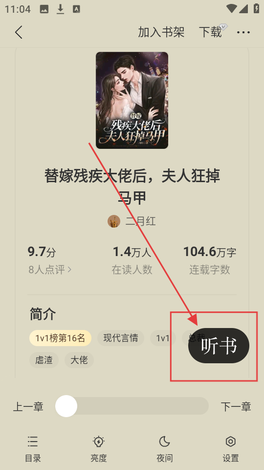 2、进入小说详情页后,点击【听书】按钮,就能开启听书模式啦。