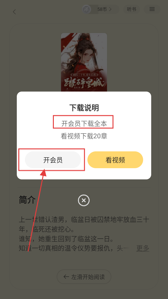 3、点击【下载】后,会弹出下载说明框,可选择开会员下载全本或看视频下载部分章节啦。