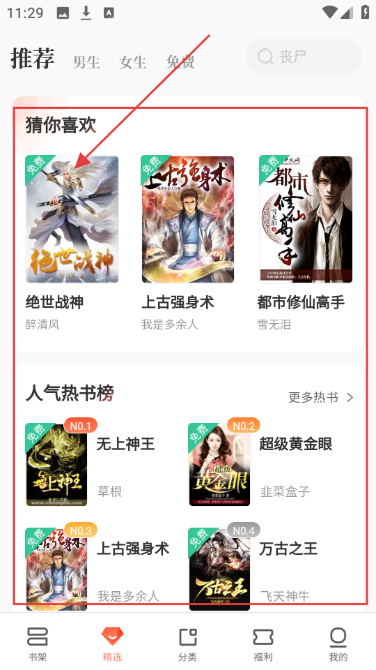 1、在精选页面,“猜你喜欢”和“人气热书榜”里有不少好书,像【绝世战神】就值得一看,快选本感兴趣的吧。