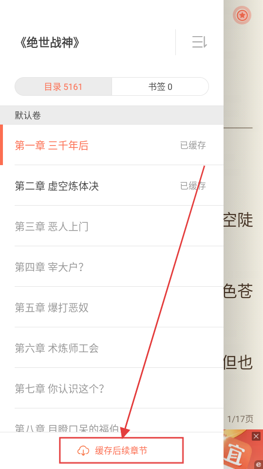 3、打开目录后,能看到章节列表,点击【缓存后续章节】,就能把后面的章节缓存下来,方便离线阅读哟。
