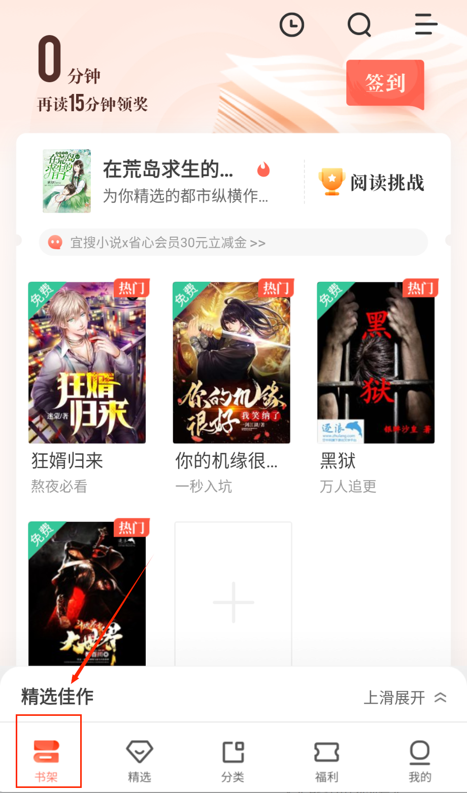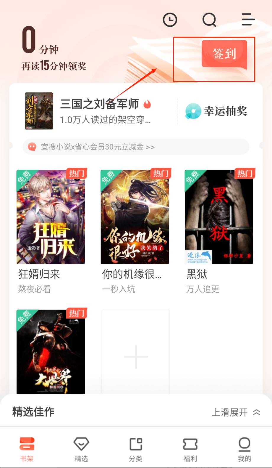 4、日常使用别忘了签到领福利,在福利页面点击"立即签到",连续签到还能抽奖,参与阅读挑战等活动能获得金币书券等奖励啦。