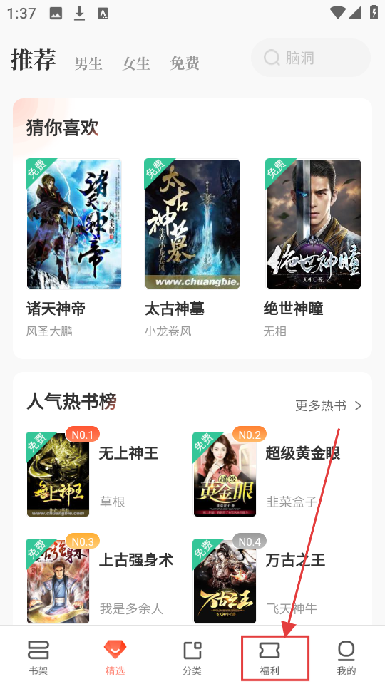 1、精选页面有不少好书,但若想领福利,就点击底部【福利】,进入福利任务页面看看。