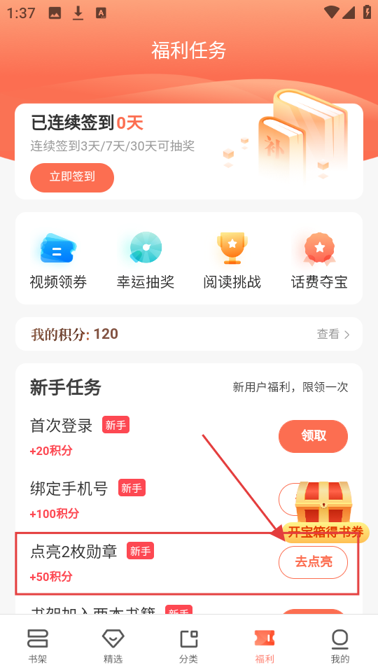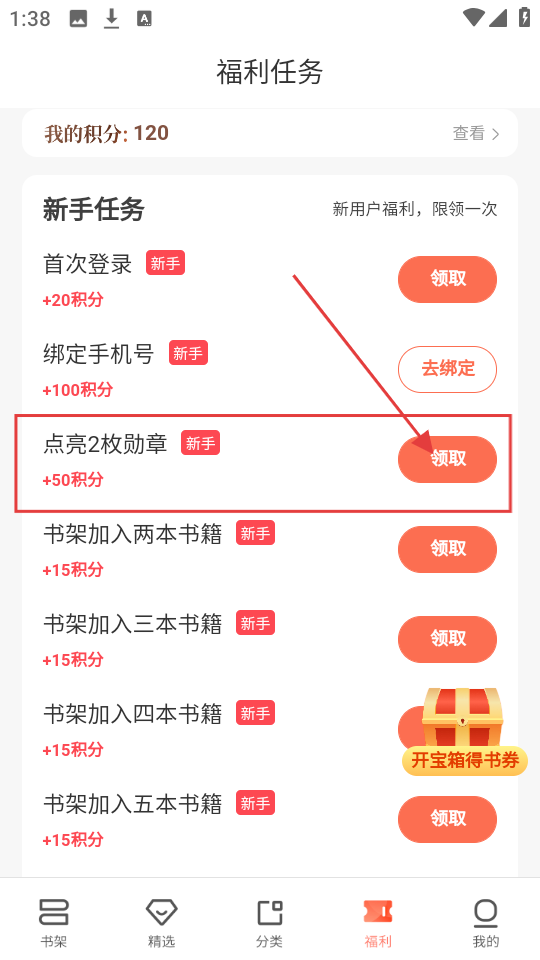 4、成功点亮2枚勋章后,回到福利任务的新手任务处,点击“点亮2枚勋章”旁的【领取】,就能获得积分奖励。
