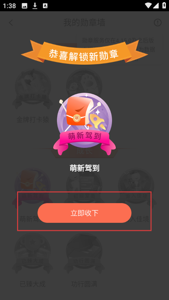 3、解锁新勋章后,会弹出提示,点击【立即收下】,就能领取这枚新解锁的勋章啦。