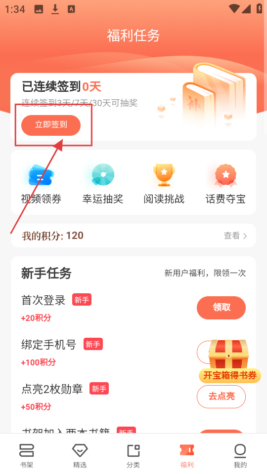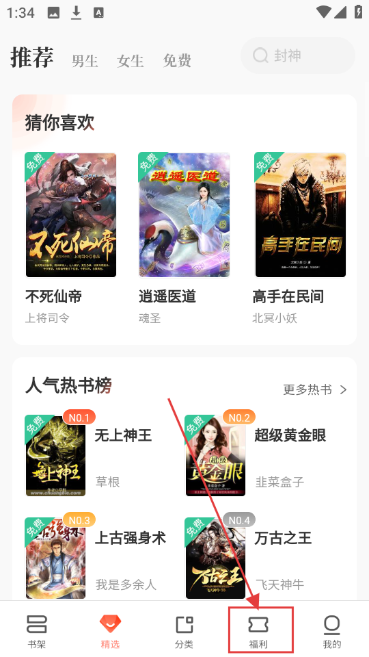 1、精选页面有“猜你喜欢”和“人气热书榜”,但若想领福利,就点击底部【福利】,进入福利任务页面。