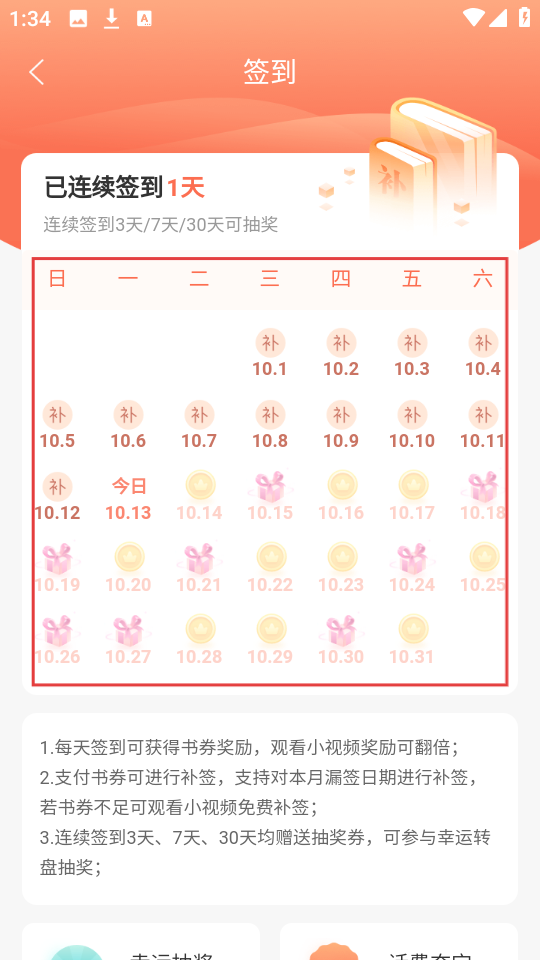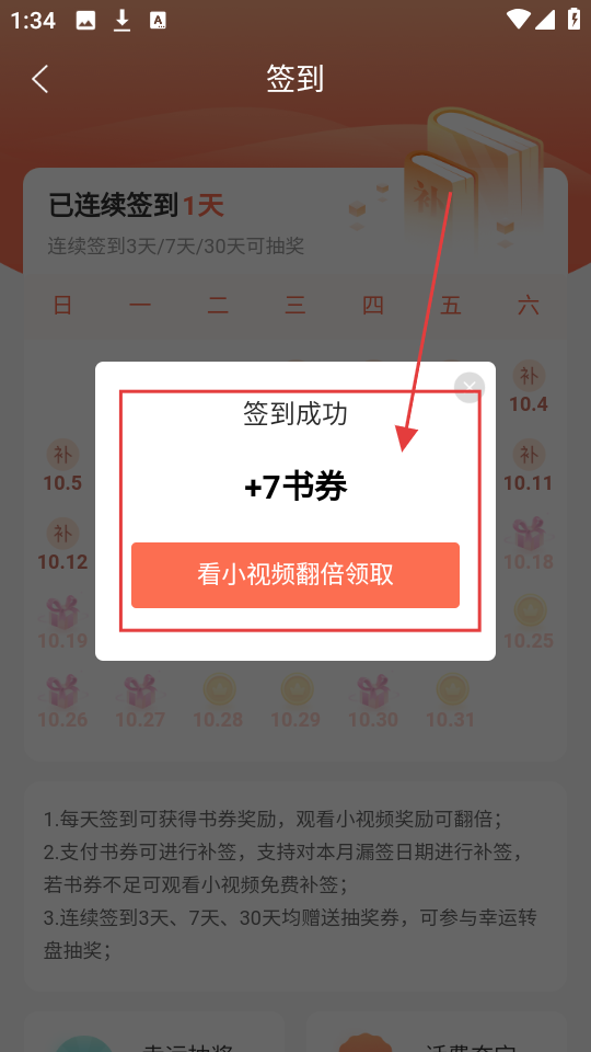 3、点击签到后,会提示“签到成功”并获得书券,还能点击“看小视频翻倍领取”,获取更多书券。