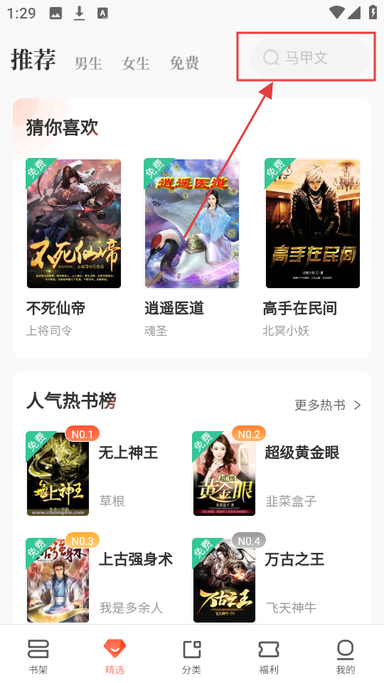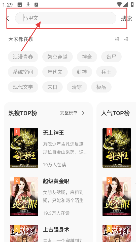 2、你们可以点击搜索栏,就可以根据你们的阅读喜好来进行更好进行搜索即可找到。
