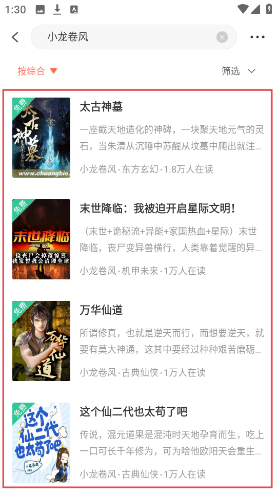 4、点击后,就能看到“小龙卷风”创作的《太古神墓》《末世降临:我被迫开启星际文明!》等小说啦。