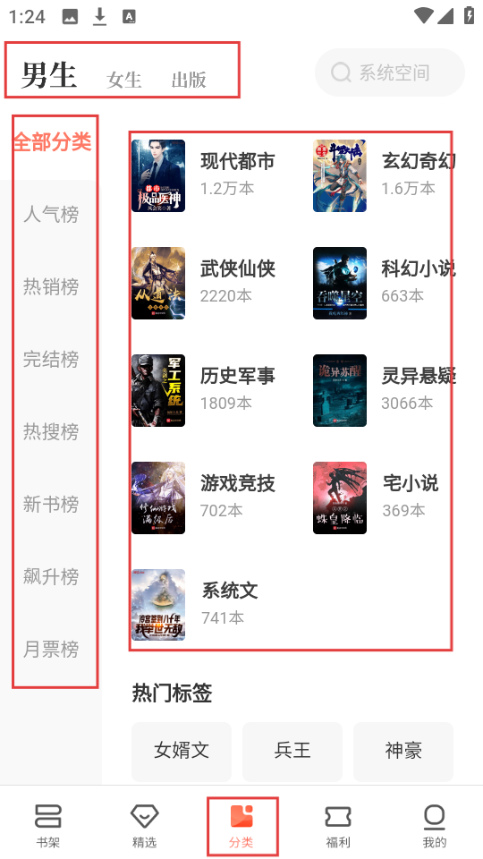 1、打开APP,点击【分类】,进入分类页面,选择【男生】频道,查看男生类小说分类啦。