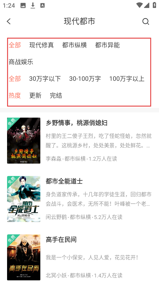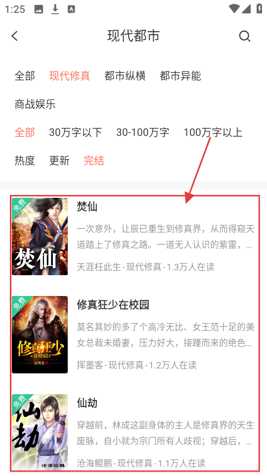 3、在现代都市分类下,选择【现代修真】子类别,再筛选【完结】状态,找到符合要求的小说啦。