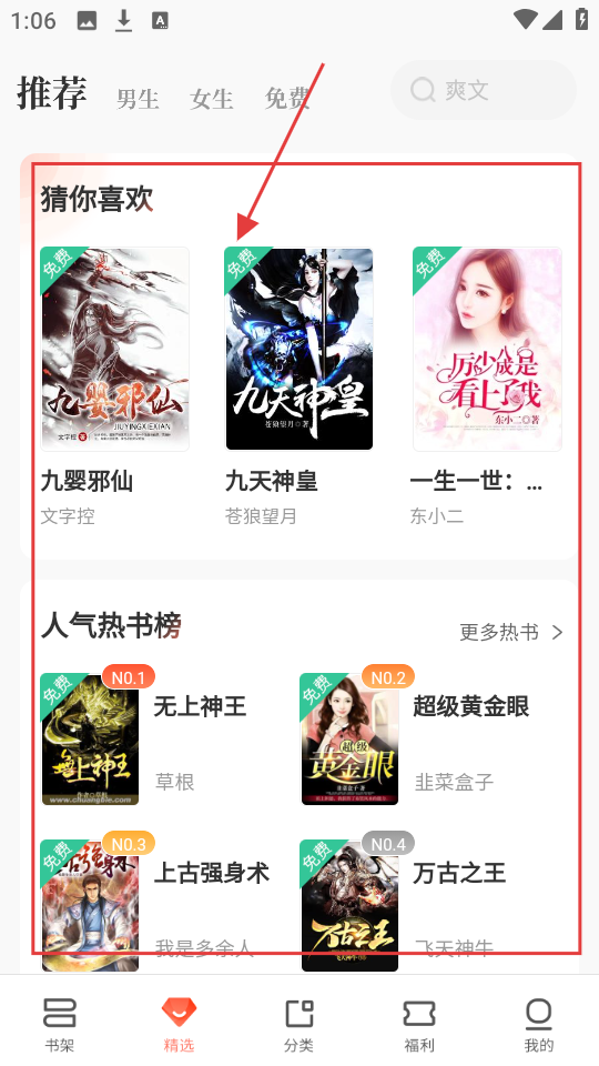 1、我们进入软件精选页面,能看到【猜你喜欢】【人气热书榜】等板块,若有想看的小说,点击它进入阅读吧。