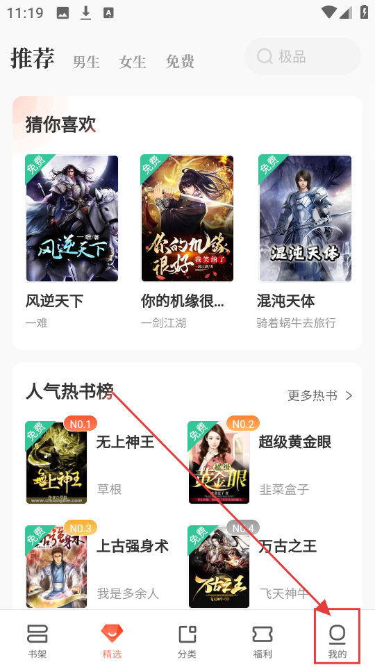 2、想找小说可以浏览首页的"推荐"板块,这里分男生、女生、免费等分类,还有猜你喜欢和人气热书榜,点击书籍封面就能直接开始阅读哦。