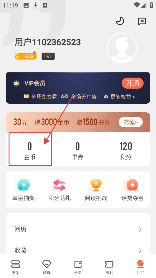 2、在个人中心页面,找到【金币】选项,点击它,进入我的金币页面,查看金币余额。