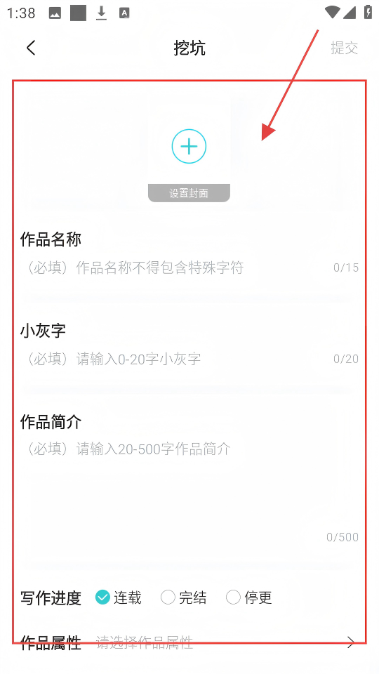 2、进入挖坑页面,设置封面,填写作品名称、小灰字、作品简介等必填项,选择写作进度,超简单的。