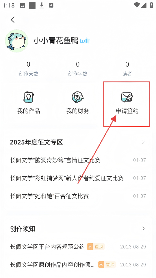 1、在个人页面,点击【申请签约】,就能进入签约申请流程啦。