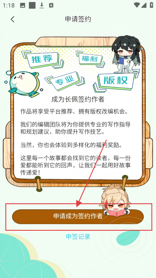 2、进入申请签约页面,了解签约福利后,点击【申请成为签约作者】,开启签约申请吧。