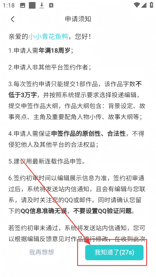 3、仔细阅读申请须知,等倒计时结束,点击【我知道了】,就能继续签约申请流程啦。