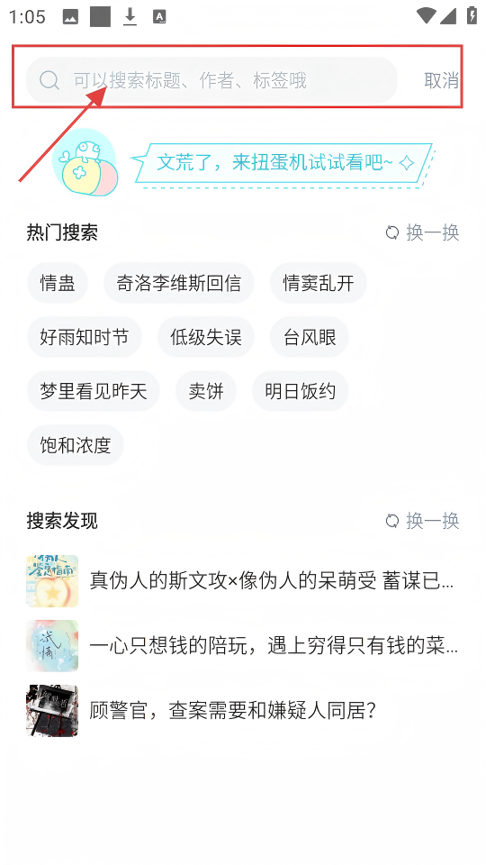 2、进入搜索页面后,在搜索框输入标题、作者或标签,就能找到相关内容,很方便的。