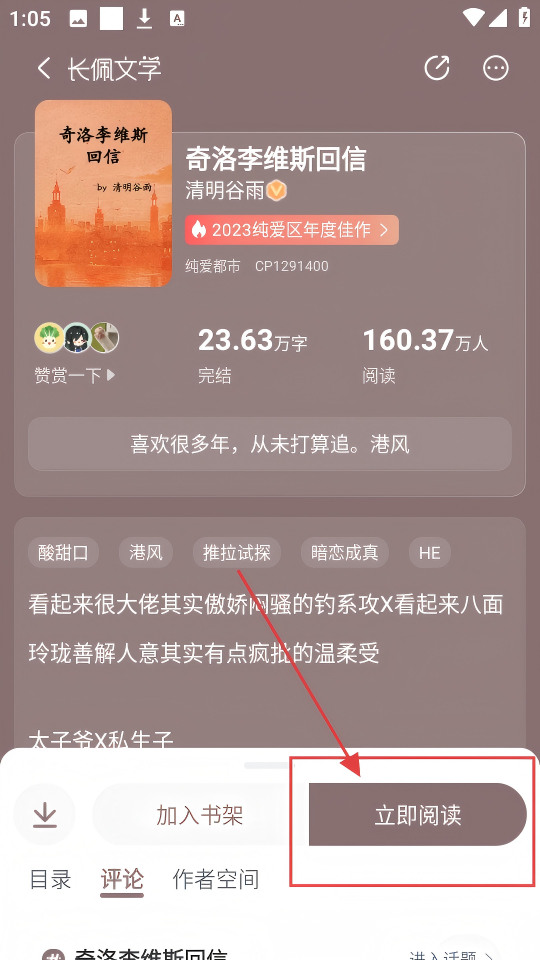 4、进入作品详情页,点击【立即阅读】,就能开始阅读作品,开启精彩阅读之旅啦。