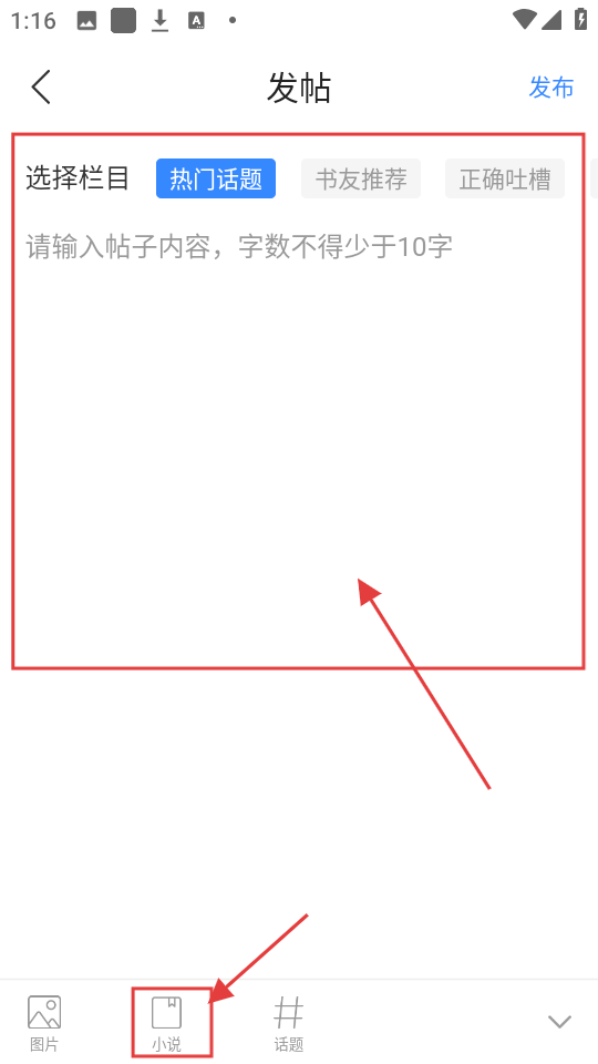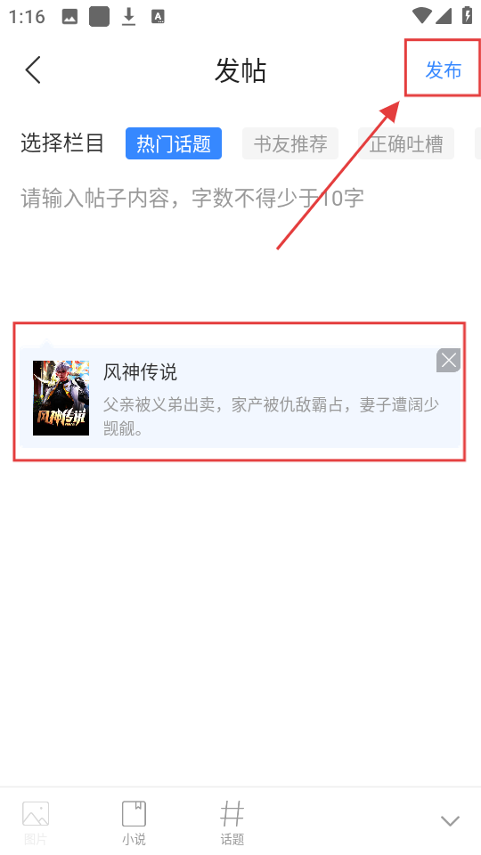 3、在发帖页面,可选择热门话题等栏目,输入帖子内容,还可添加小说等内容啦。