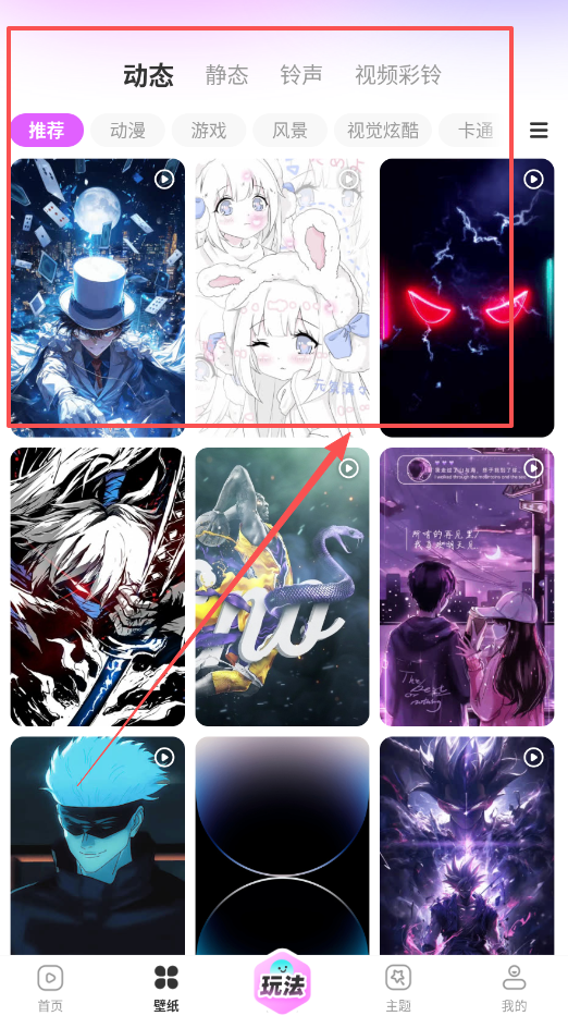 2、进入壁纸专区后,你会看到动态、静态、铃声等多种分类,推荐、动漫、游戏等标签也很醒目,操作简单快捷呢。