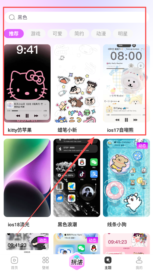 3、如果你喜欢更换主题,可以在主题页面浏览黑色、可爱、简约等风格,比如kitty仿苹果、蜡笔小新等热门主题。