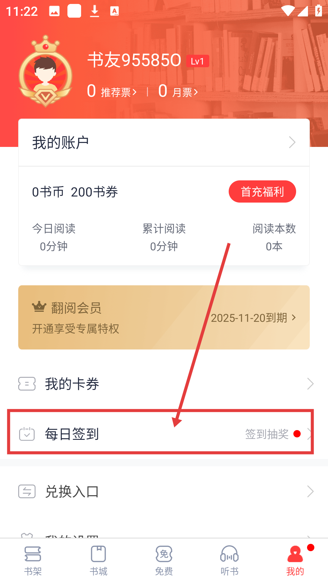 2、在个人界面点击【每日签到】,进入每日福利界面,准备领书券啦。