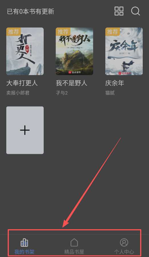 3、你的个人书架不仅是存书的地方,还会贴心地提示书籍更新。首页的推荐和更多板块,持续为你推荐卖报小郎君等人的作品。